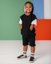 Elevate your little one’s comfort and style with this set. This versatile ensemble features a hooded top with a faux tee design underneath, giving the look of a layered outfit without the bulk. The set also includes matching bamboo shorts, offering both comfort and breathability.