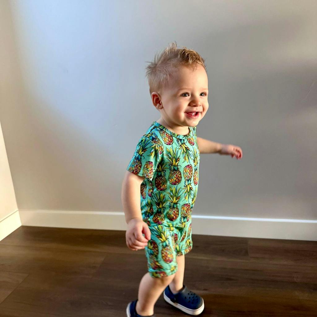 - Snaps along the inseam for easy diaper changes
