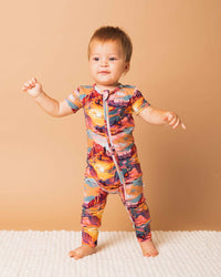 - Two-way cross-body front zipper, footless romper